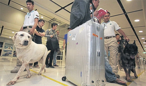 Cảnh sát và chó nghiệp vụ được triển khai tuần tra ở một nhà ga tàu điện trên không Bangkok (Thái Lan) ngày 21-2. Ảnh: BANGKOK POST