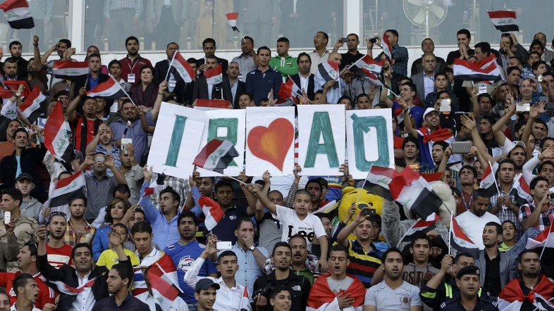 Người hâm mộ reo hò tại một trận bóng đá giao hữu quốc tế tại sân vận động al-Shaab ở Iraq. Ảnh: AP
