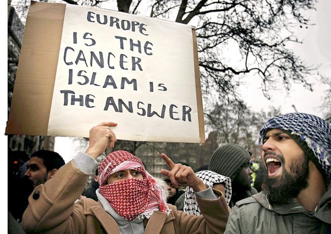 Các phần tử Hồi giáo cực đoan tại châu Âu giơ cao tấm bảng: "Châu Âu là ung thư. Hồi giáo là lời giải". (Ảnh: AP)