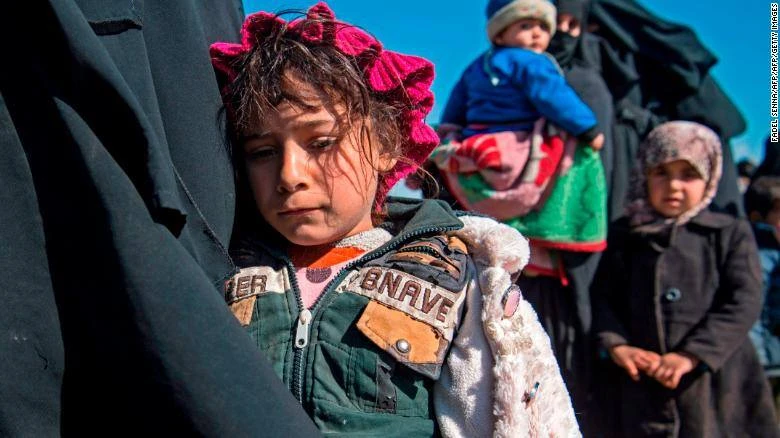 Phụ nữ và trẻ em đứng trên một cánh đồng sau khi chạy trốn khỏi khu vực Baghouz ở tỉnh Deir Ezzor phía Đông Syria vào ngày 12-2-2019. Ảnh: CNN