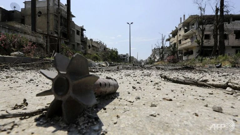Một súng cối tròn được tìm thấy tại khu vực bị phá hủy thuộc thành phố Homs, Syria.