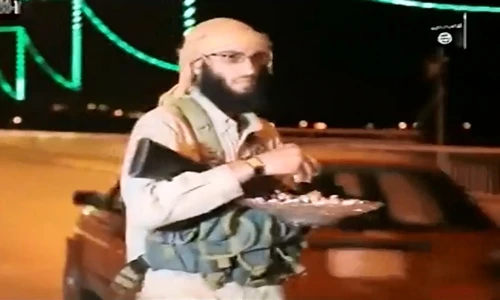 Các tay súng vũ trang đi đang phát kẹo mừng (Ảnh cắt từ clip). Nguồn: Jerusalem Post