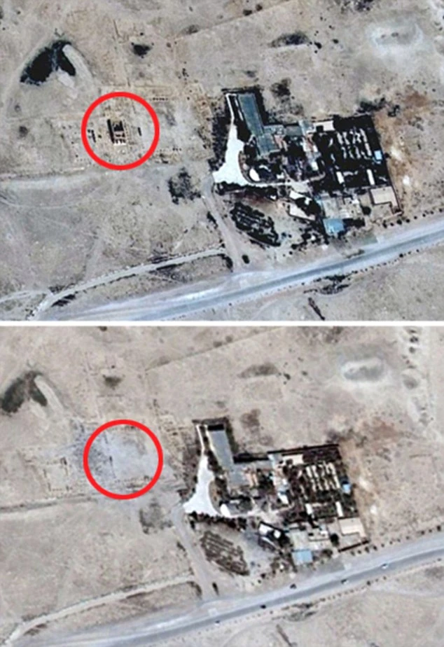 Những hình ảnh đầu tiên từ vệ tinh vào ngày 26-6, cùng với các hình ảnh sau đó vào ngày 27-8 cho thấy các binh lính IS đã san phẳng hoàn toàn đền thời Baal Shamin.
