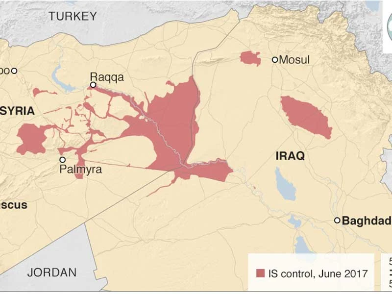 Lúc thông báo thành lập nhà nước Hồi giáo ở Mosul (Iraq) cách đây ba năm, IS kiểm soát 90.000 km2, nay chúng chỉ còn kiểm soát 36.200 km2 tính đến tháng 6-2017.