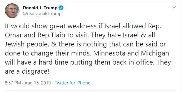 "Nó sẽ cho thấy sự yếu kém lớn nếu Israel cho phép các nghị sĩ Omar và Tlaib đến thăm", ông Trump viết trên Twitter. "Họ không ưa Israel và tất cả người Do Thái, và không có gì có thể nói hoặc làm để thay đổi suy nghĩ của họ”.