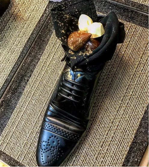 Tất nhiên một đầu bếp giỏi, nổi tiếng thì không còn nghi ngờ gì về tay nghề nấu ăn, chỉ có điều món tráng miệng ở phần cuối bữa tiệc gây ra không ít tranh cãi khi nó được phục vụ trong một chiếc giày. Kẹo hạt dẻ sô cô la ngon lành được bài trí hết sức nghệ thuật trong một chiếc giày da sáng bóng.