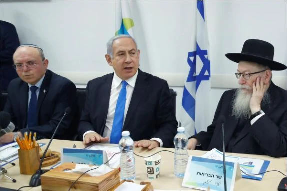 Thủ tướng Israel Benjamin Netanyahu (ngồi giữa) chủ trì cuộc họp đánh giá việc kiểm soát COVID-19 với Bộ trưởng y tế Yaakov Litzman (bên phải) ngày 23-2. Ảnh: REUTERS