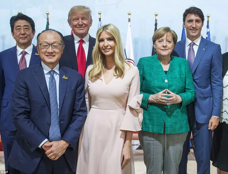 Hình ảnh đăng trên Twitter cho thấy Ivanka Trump đang ngồi thế chỗ cha cô bên cạnh các nhà lãnh đạo các nước.