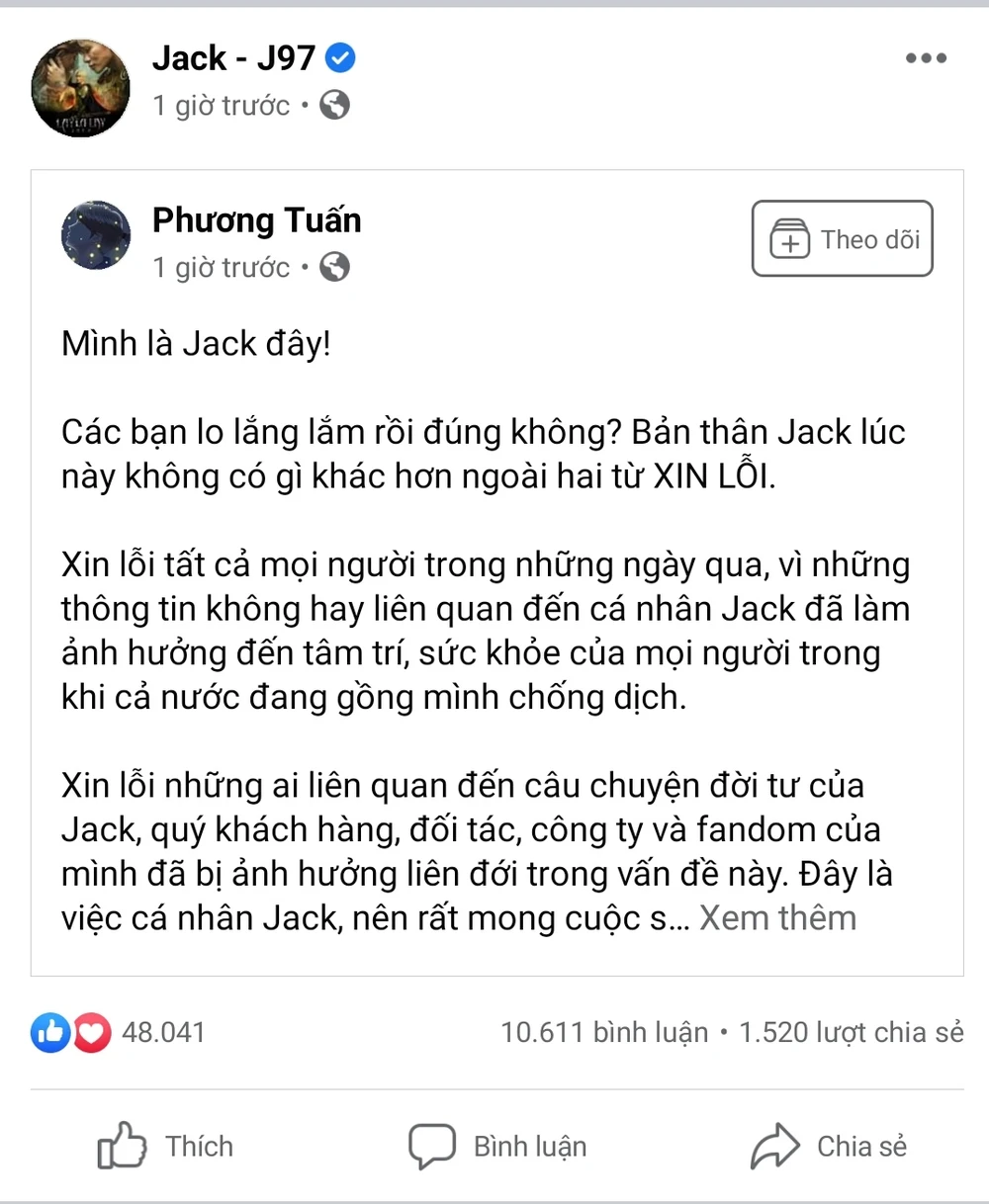 Cụ thể, tối qua (10-8), sau những ngày im lặng, Jack đã chính thức lên tiếng trên trang cá nhân về vụ việc lùm xùm đời tư ồn ào những ngày qua. Anh gửi lời xin lỗi vì đã làm ảnh hưởng đến mọi người, quý khách hàng, đối tác, công ty và fandom của mình.