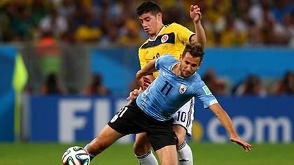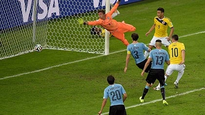 Uruguay đã gục ngã trước sự xuất sắc của James Rodriguez. Ảnh: FIFA.com.