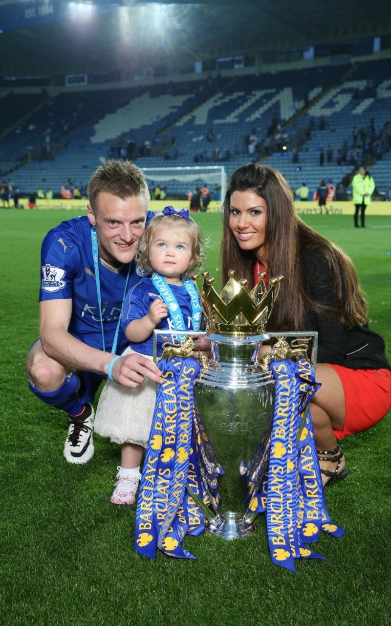 Jamie Vardy và Rebekah Nicholson hạnh phúc với chiếc cúp vô địch.