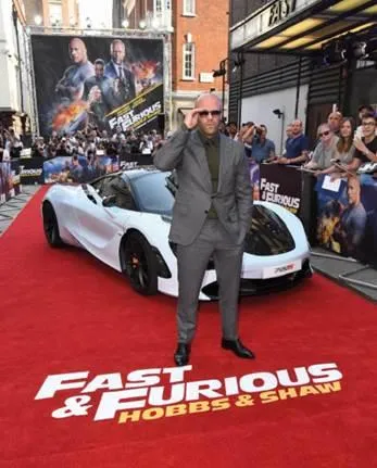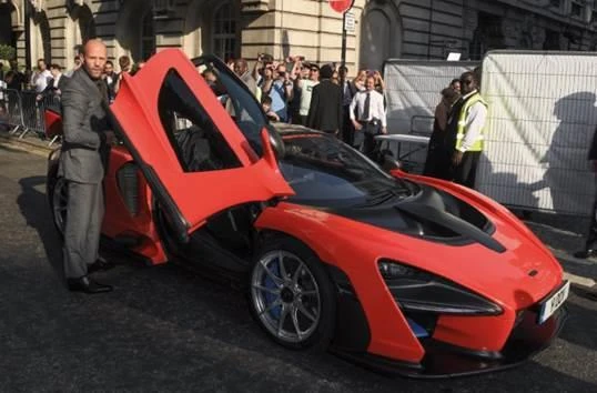 Jason Statham đến buổi công chiếu trên chiếc siêu xe huyền thoại McLaren Senna đen đỏ vô cùng nổi bật – mẫu xe thuộc dòng Ultimate Series của thương hiệu xe đến từ Anh quốc.