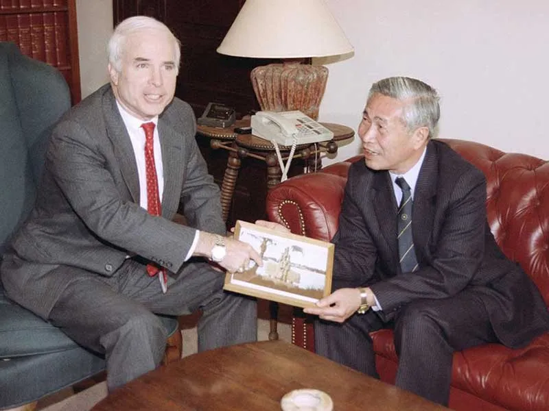 Nghị sĩ John McCain trong buổi tiếp Bộ trưởng Ngoại giao Nguyễn Cơ Thạch - bộ trưởng ngoại giao đầu tiên của Việt Nam đến Mỹ sau ngày đất nước thống nhất - tại trụ sở Quốc hội Mỹ ngày 17-10-1990. Ảnh: AP