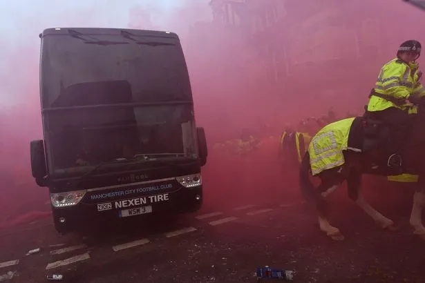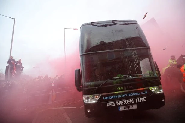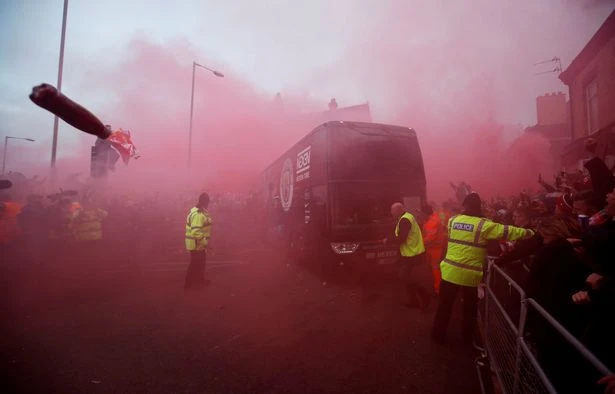 Hàng trăm fan Liverpool đã vây lấy chiếc xe buýt của Man. City và bắt đầu có hành động quá khích. Đám đông CĐV Liverpool hò hét, ném chai lọ, pháo sáng vào chiếc xe. Rất may là các cầu thủ Man. City vẫn bình an vô sự.