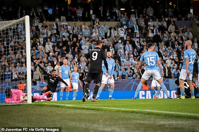 Đến phút bù giờ hiệp một, Juventus có được bàn thắng thứ ba khi tận dụng hàng thủ lỏng lẻo của chủ nhà Malmoe. Từ pha kê chân kiến tạo của Rabiot, cầu thủ bên phía đội chủ nhà phòng ngự hời hợt tạo cơ hội cho Morata thoát xuống vòng cấm, ghi bàn thắng nâng tỷ số lên 3-0.