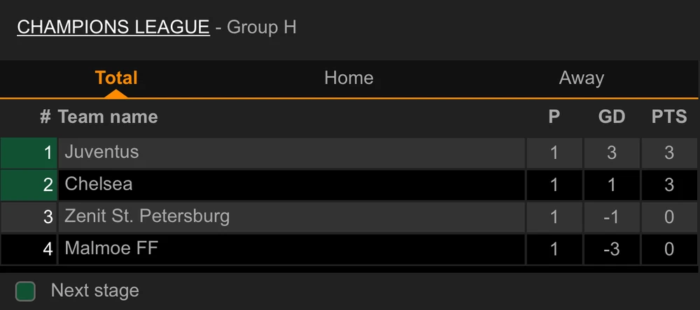 Giành chiến thắng trên sân Malmoe FF với tỷ số 3-0, Juventus vươn lên vị trí đầu bảng H với 3 điểm, Chelsea đứng nhì bảng khi có cùng điểm số nhưng kém hơn Juventus về hiệu số bàn thắng khi chỉ đánh bại Zenit với tỷ số 1-0.