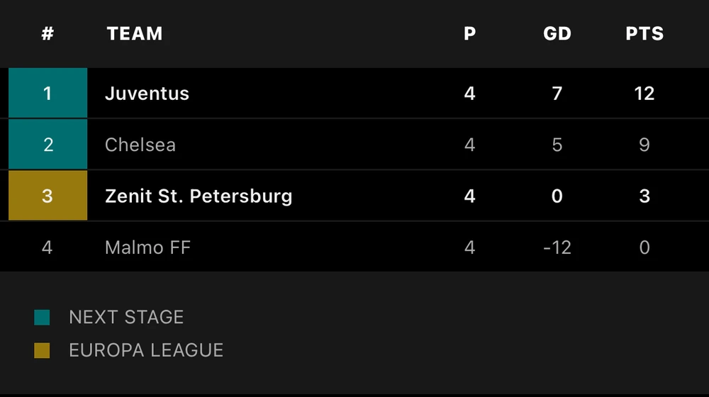 Giành chiến thắng với tỷ số 4-2, Juventus bảo vệ vị trí đầu bảng H với 12 điểm tuyệt đối sau 4 vòng đấu, xếp sau là Chelsea với 9 điểm. Như vậy, Juventus đã giành vé sớm dự vòng knock-out Champions League trước hai lượt đấu khi mà đội xếp thứ ba Zenit thua “bà đầm già” thành Turin đến 9 điểm.