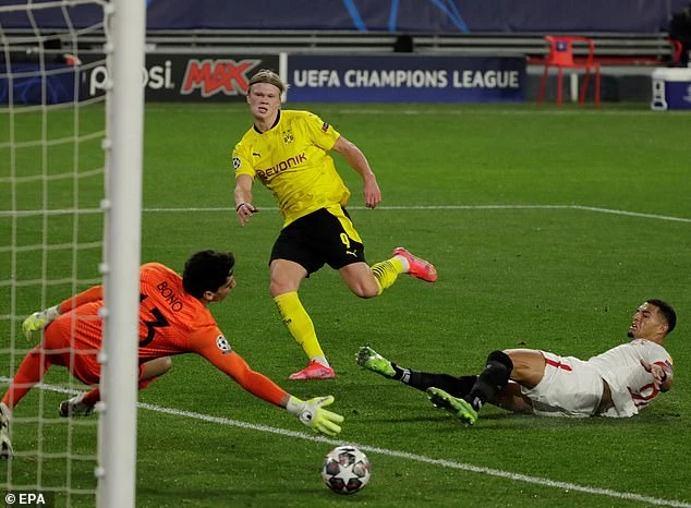 Đến phút 27, Haaland có pha ban bật một chạm với Sancho để thoát xuống vòng cấm dứt điểm giúp Dortmund lội ngược dẫn trước 2-1. Đến cuối hiệp một, từ một tình huống phản công nhanh, tiền vệ Marco Reus có pha chọc khe để cho HaaLand thoát xuống vòng cấm. Với pha dứt điểm chéo góc, Haaland giúp Dortmind khép lại hiệp một với lợi thế dẫn trước 3-1.