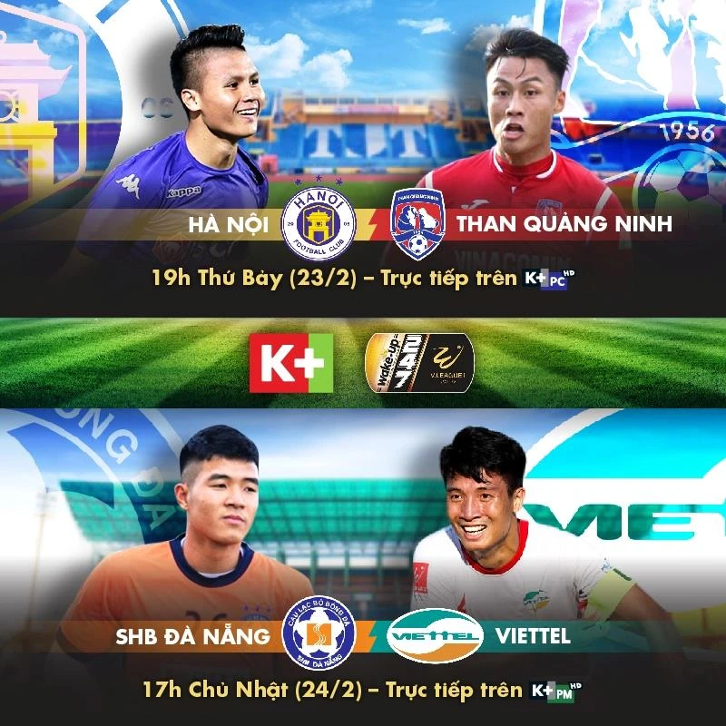 Giải vô địch quốc gia bắt đầu từ ngày 21-2 đến tháng 10-2019. Ngay từ vòng đầu tiên của V-League, khán giả đã được theo dõi 2 trận đấu hấp dẫn: Hà Nội - Than Quảng Ninh (19 giờ, ngày 23-2) và SHB Đà Nẵng - Viettel (lúc 17 giờ, ngày 24-2) trên các kênh của K+.