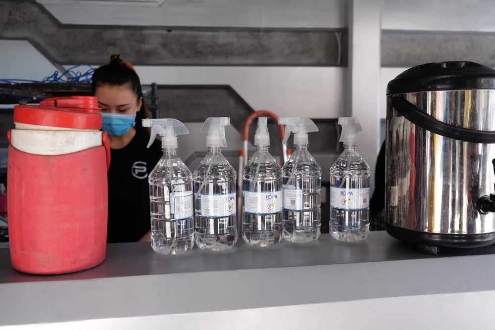 Trong quán cũng chuẩn bị nước sát khuẩn, nước rửa tay... cho khách và nhân viên sử dụng.