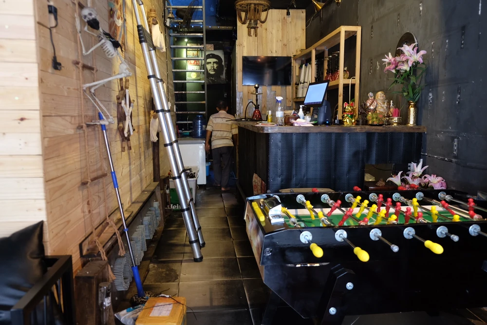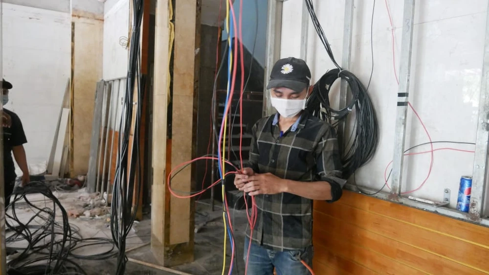 Bên trong quán đang được sửa sang và lắp đặt lại thiết bị điện.