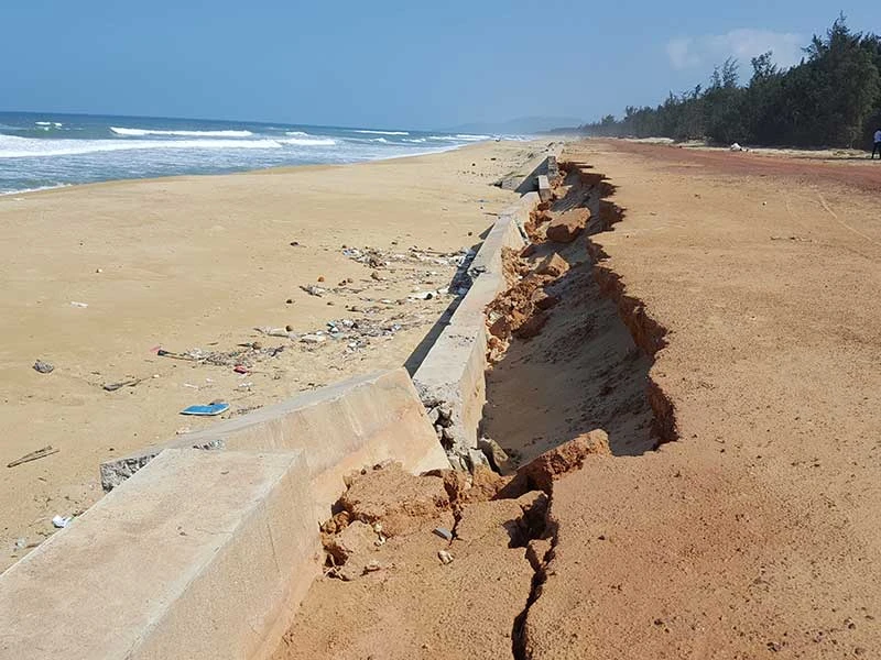 Thời gian qua, công trình trên liên tục hư hỏng ngay sau khi đưa vào sử dụng. Theo ghi nhận của PV, rất nhiều đoạn bê tông cốt thép của hệ thống đê biển này đã bị đổ sụp, tan hoang. Nhiều vị trí bị gãy đổ, sắt thép lòi ra ngổn ngang. Nhiều đoạn khác đã bị cuốn mất khiến sóng biển xâm thực sâu vào thân đê bằng đất cát, gây sạt lở ngày càng nghiêm trọng. Ngay cả những đoạn kè còn lại cũng đầy vết nứt, xiêu vẹo, có nguy cơ bị sập đổ, cuốn ra biển bất cứ lúc nào…