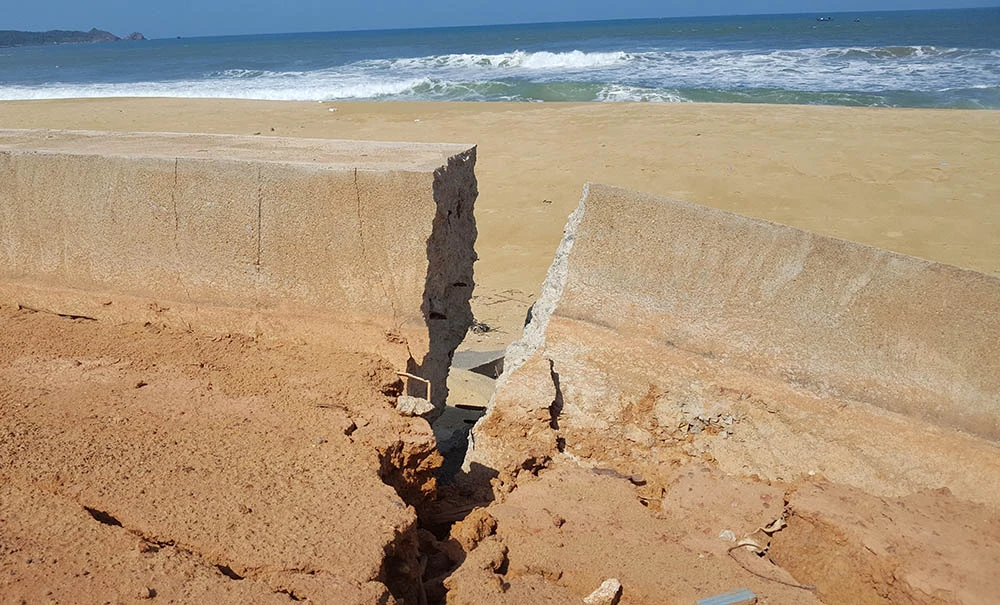 Cả hệ thống kè biển Tam Quan bị đổ sập. Ảnh: TL