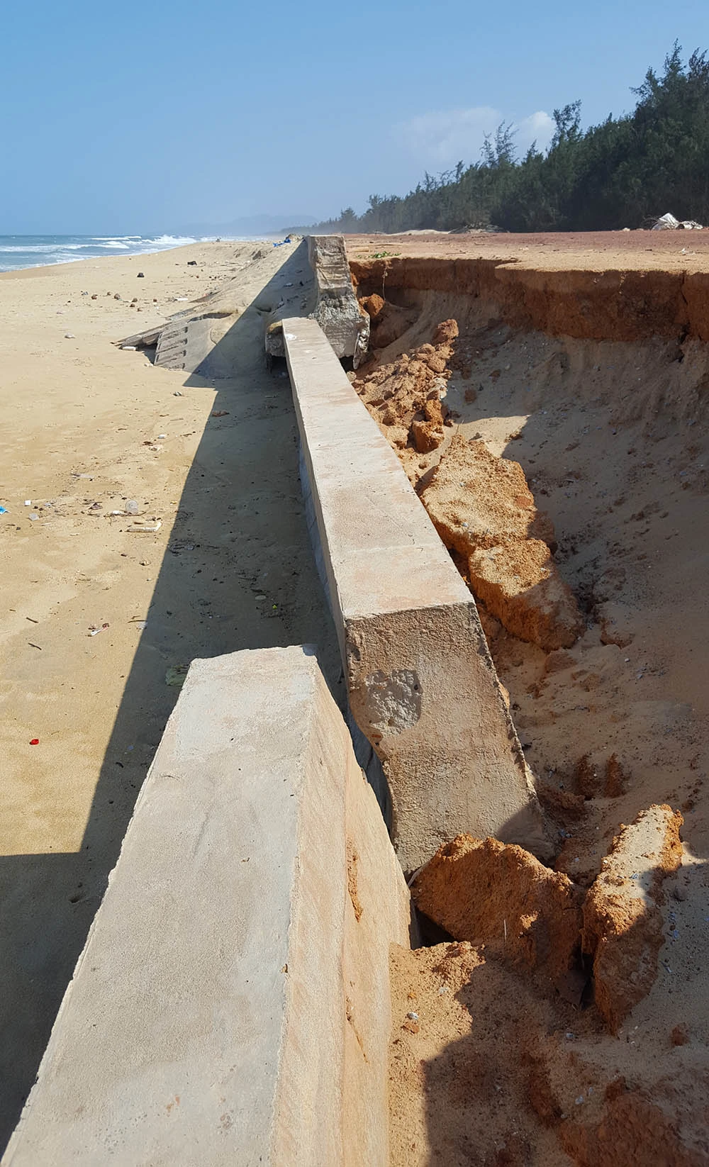 Theo đó, đơn vị tư vấn thiết kế là Công ty CP Tư vấn đầu tư xây dựng SPQD (TP Quy Nhơn, Bình Định) thiếu kinh nghiệm trong thiết kế các công trình kè đối với bãi ngang, bờ biển biến động mạnh. Do đó, đơn vị này chọn phương án tuyến chưa hợp lý, kết cấu thân kè, chân kè chưa đảm bảo chịu lực trực tiếp từ sóng biển.