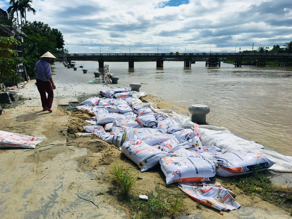 TP Hội An cử lực lượng dùng bao cát đắp lên vị trí sụt lún. Ảnh: TN