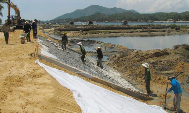 Thi công công trình kè chống xói lở đầm Cù Mông. Ảnh: SƠN CA