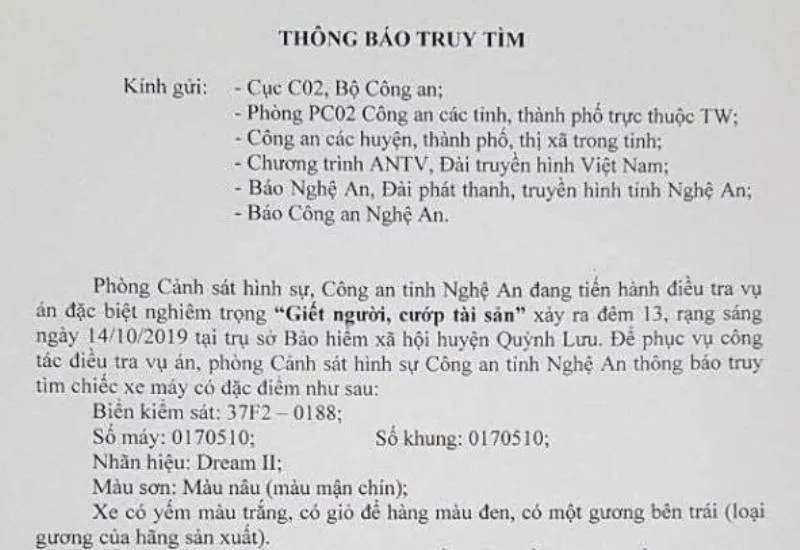 Chiều tối 14-10, Đại tá Phạm Hoài Nam, Trưởng phòng Cảnh sát hình sự, Công an tỉnh Nghệ An, cho biết đã tìm thấy chiếc xe máy hiệu Dream II trong vụ án “giết người, cướp tài sản” xảy ra đêm 13 rạng sáng 14-10 tại trụ sở Bảo hiểm xã hội (BHXH) huyện Quỳnh Lưu (Nghệ An).