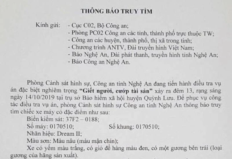 Sau khi Cơ quan CSĐT Công an tỉnh Nghệ An ra thông báo truy tìm đã tìm thấy chiếc xe máy trong vụ án.