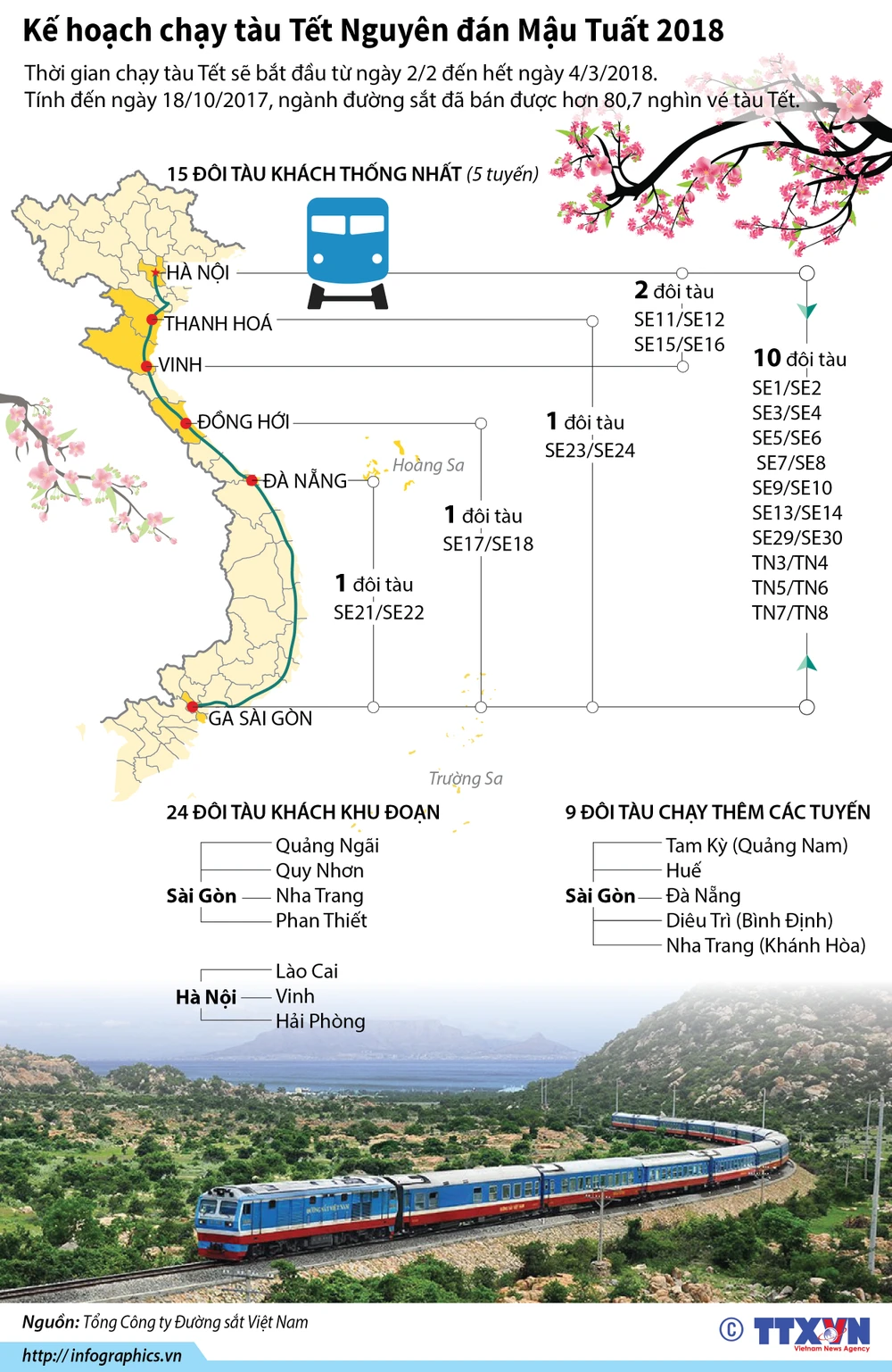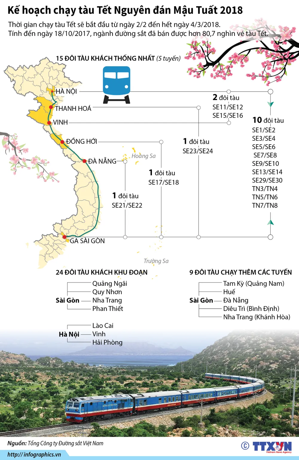 Thời gian chạy tàu Tết sẽ bắt đầu từ ngày 2-2 đến hết ngày 4-3-2018. Tính đến ngày 18-10-2017, ngành đường sắt đã bán được hơn 80,7 ngàn vé tàu Tết.