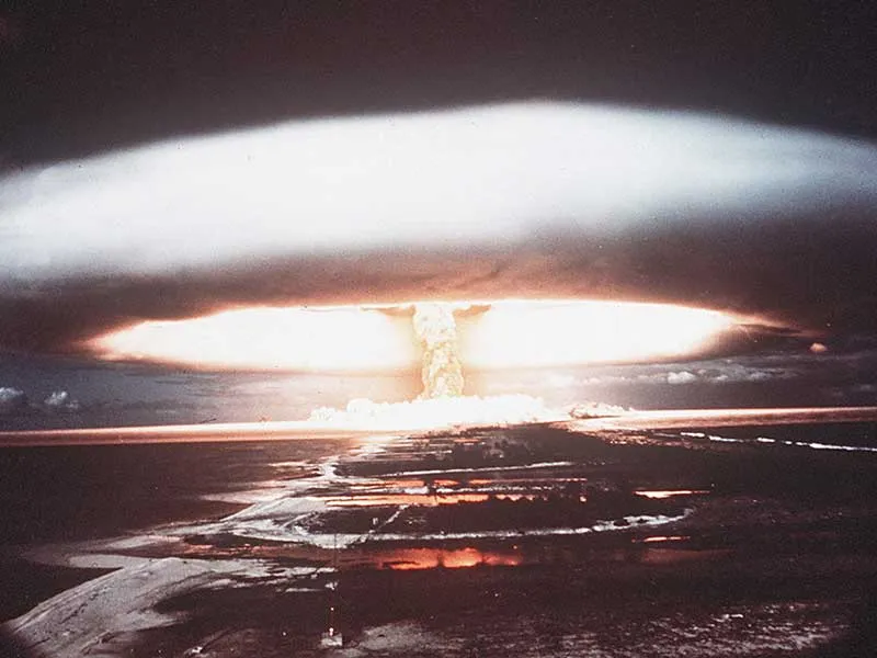Một vụ thử hạt nhân năm 1971 gần đảo Muruaroa, Thái Bình Dương. Giai đoạn này Mỹ bị Liên Xô bỏ xa trong cuộc đua bảo vệ người dân và chính phủ sống sót sau chiến tranh hạt nhân. Ảnh: GETTY