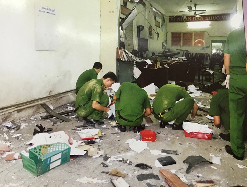 Cảnh sát khám nghiệm hiện trường vụ nổ. Ảnh chụp lại từ tư liệu công an.