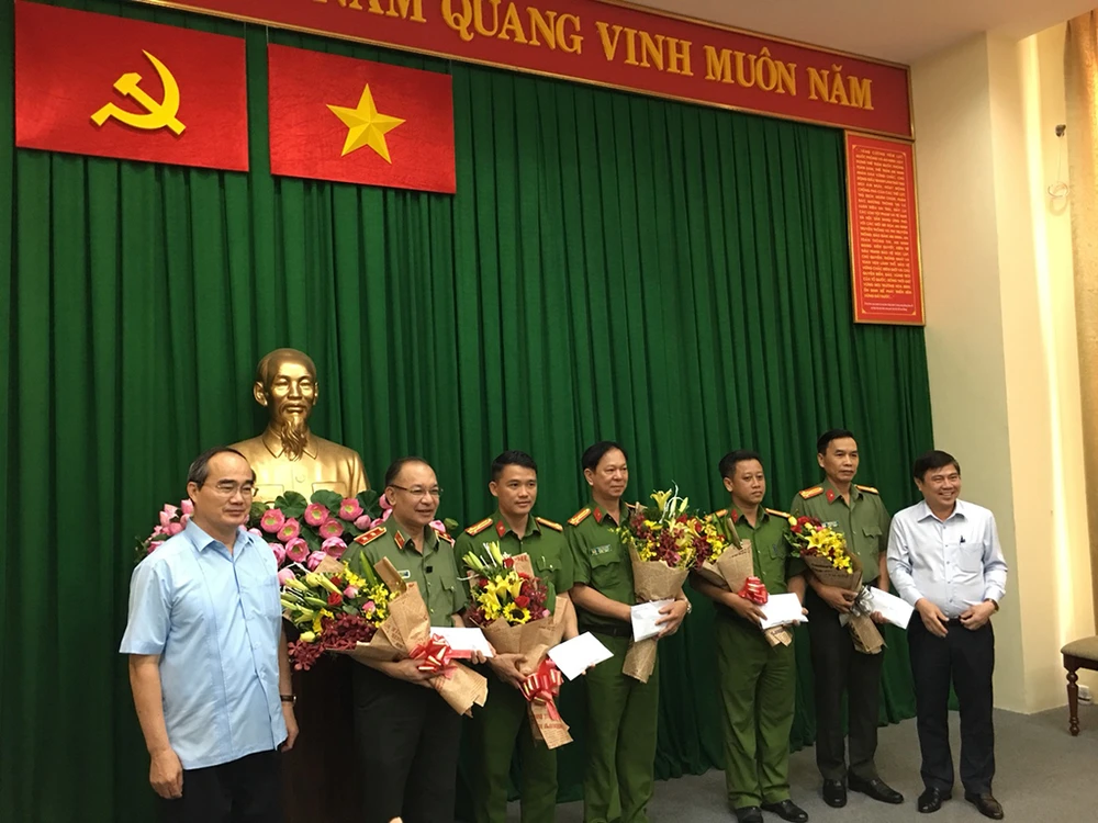 Ngày 5-7, lãnh đạo TP.HCM đã chúc mừng và khen thưởng các đơn vị nghiệp vụ Công an TP.HCM vì lập thành tích xuất sắc trong phá án vụ nổ ở trụ sở Công an phường 12, quận Tân Bình. Ảnh: NGUYỄN TÂN
