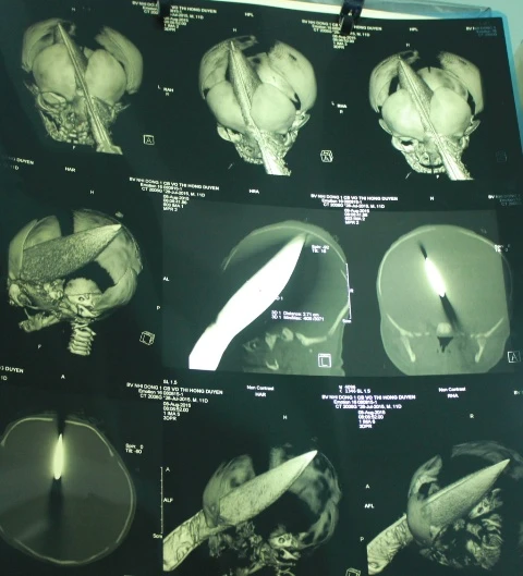 Kết quả chụp CT cho thấy, vết thương từ hốc mắt trái xuyên qua não phải, thấu ra phía sau với chiều dài 11 cm. Các BS BV Nhi đồng 1 kết hợp hội chẩn với BS ngoại thần kinh BV 115, đánh giá bệnh nhi có thể đột tử bất cứ lúc nào do vết thương kèm tiền sử bệnh viêm phổi. Ngay sau đó bệnh nhi được đẩy vào phòng mổ cấp cứu, mở hộp sọ, sau hơn ba giờ, các BS đã lấy con dao ra khỏi đầu bệnh nhi.