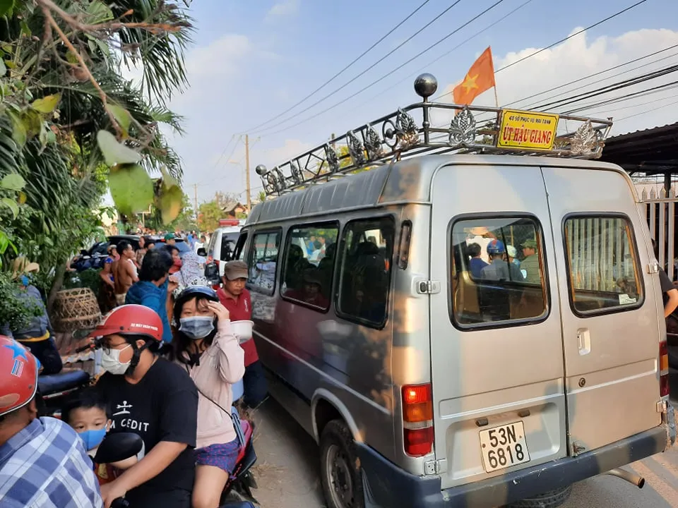 Xe cấp cứu, xe tang đang vào hiện trường. Công an phong tỏa dày đặc từ ngoài đường tỉnh lộ 15 (cách hiện trường khoảng 200 m).
