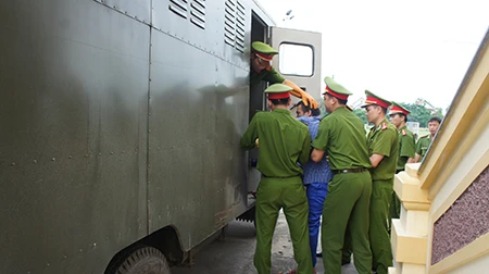 Cảnh sát dẫn giải bị cáo Phan Công Trọng về Trại tạm giam Công an tỉnh Nghệ An. Ảnh: Đắc Lam.