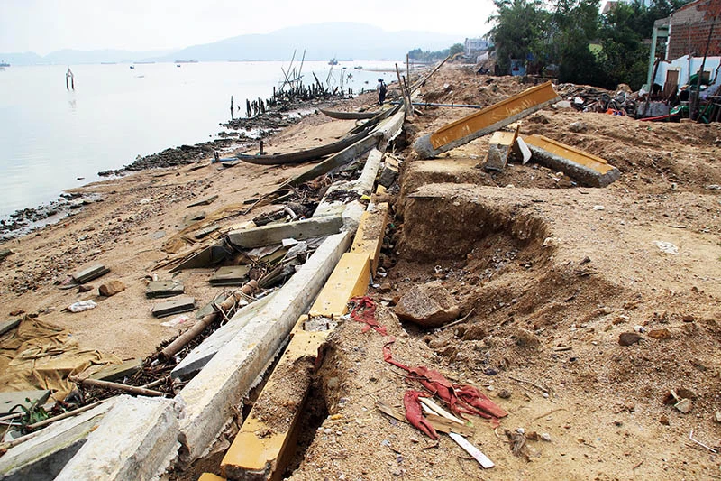 Thế nhưng khi xảy ra cơn bão số 5 vào tối 30-10, sóng lớn đã phủ lên hệ thống lan can, giằng mái taluy tuyến kè làm công trình bị hư hỏng. Cụ thể, làm sập toàn bộ 400 m mái kè, làm hư hỏng phần tấm bê tông lát mái taluy, phần đất đắp thân kè 80 m; thiệt hại khoảng 2 tỉ đồng.