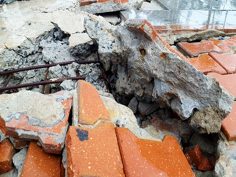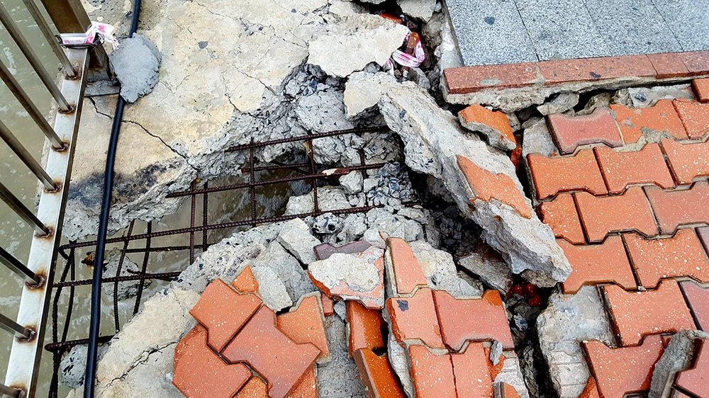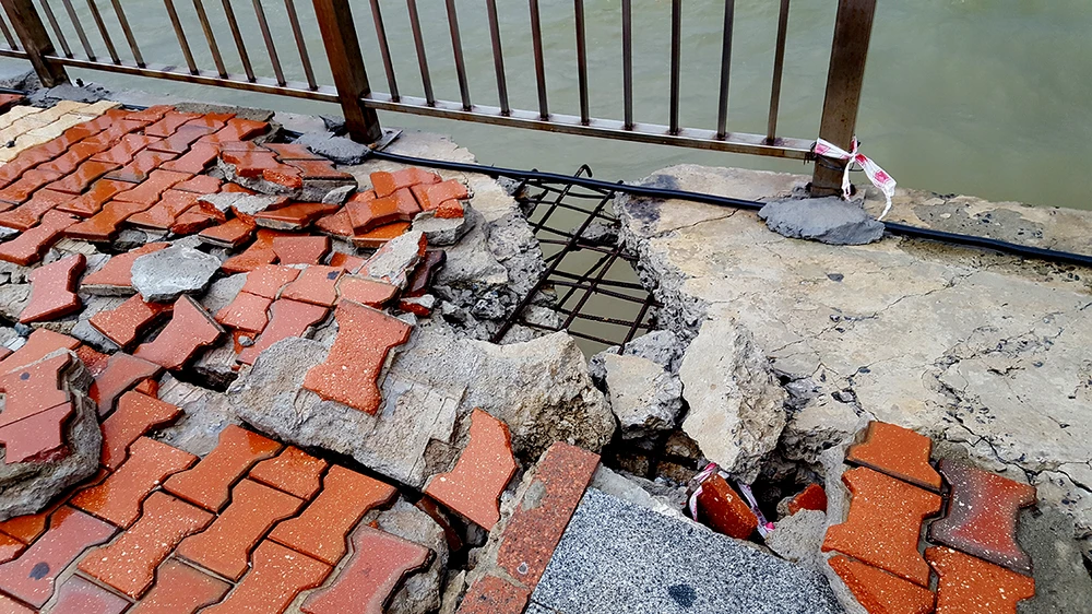 Gạch lót vỉa hè bị bong bật ra ngoài, nằm ngổn ngang, lộ phần thép bên dưới và hộc sâu. Ảnh: N.TRI
