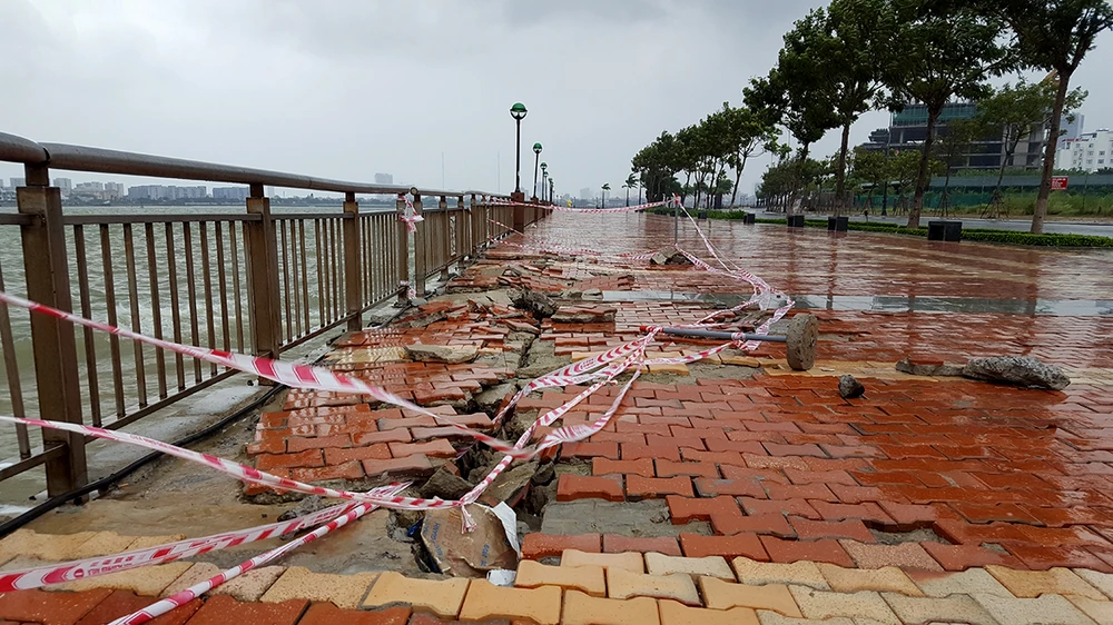 Do ảnh hưởng của áp thấp nhiệt đới khiến sóng đánh dữ dội vào kè sông Hàn trên đường Như Nguyệt khiến kè hư hỏng. Ảnh: N.TRI
