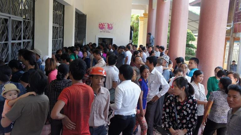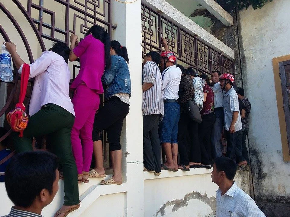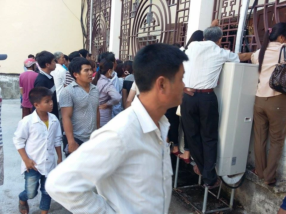 Người dân kéo đến dự tòa mỗi lúc một đông, không đủ chỗ, nhiều người phải đeo bám đu lên tường rào ngoài trung tâm để ngóng vô...