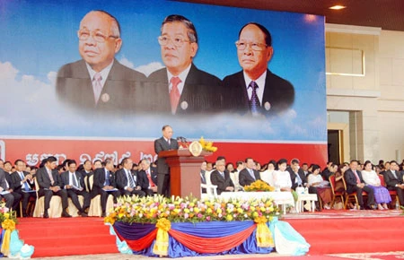 Đại sứ Việt Nam tại Campuchia Ngô Anh Dũng cùng tham dự. Chủ tịch Quốc hội Heng Samrin (ảnh) đã ôn lại thời kỳ đen tối nhất trong lịch sử Campuchia; chế độ Campuchia Dân chủ do Pol Pot cầm đầu đã tàn sát gần ba triệu dân. Ông nêu rõ CPP đã giành thắng lợi lịch sử ngày 7-1-1979, lật đổ chế độ Pol Pot với sự giúp đỡ của nhân dân yêu chuộng hòa bình trên thế giới, trong đó có sự giúp đỡ hết sức to lớn của quân tình nguyện Việt Nam. Ông nhấn mạnh bầu cử Quốc hội khóa V vừa qua diễn ra công bằng, tuy nhiên các thế lực tự nhận là kẻ thù của chiến thắng ngày 7-1-1979 đã gây bất ổn chính trị, kinh tế và xã hội. Ông khẳng định nhân dân và CPP sẽ không cho phép đảng Cứu quốc Campuchia (đối lập) tiếp tục các hoạt động bất hợp pháp.