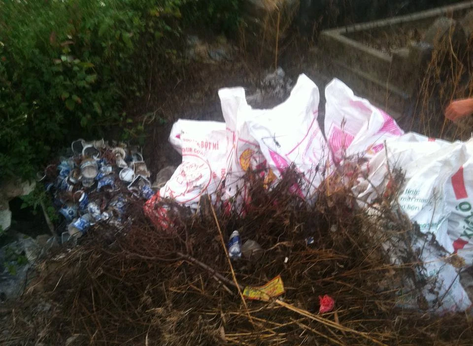 Người dân thu dọn bát nhang bị đập vỡ vào bao tải