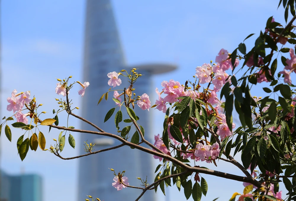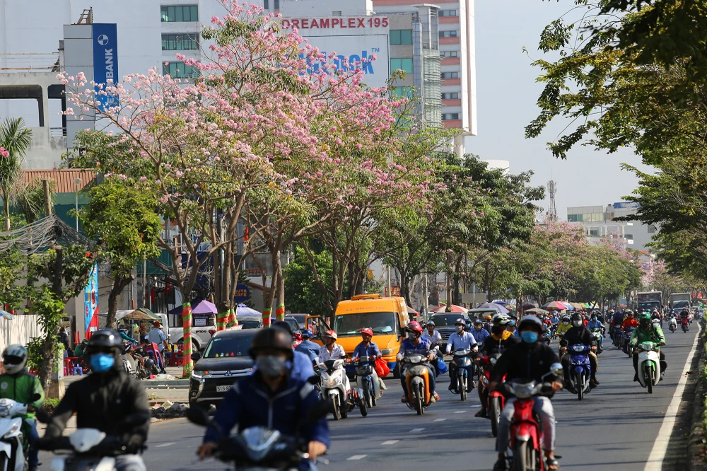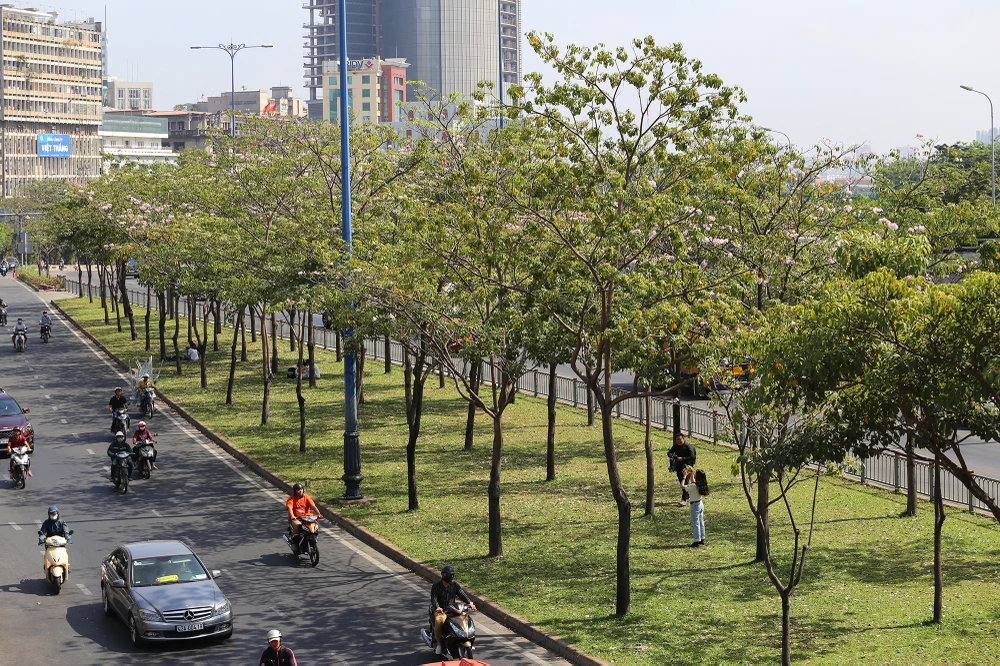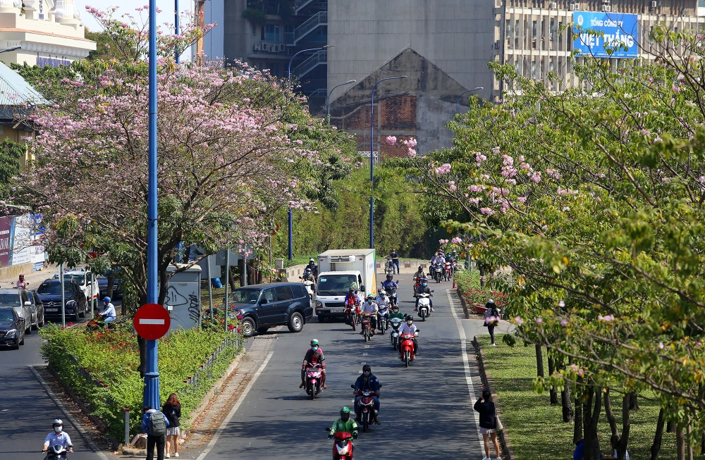 Hàng kèn hồng bắt đầu bung nở trên đường Võ Văn Kiệt (quận 1).