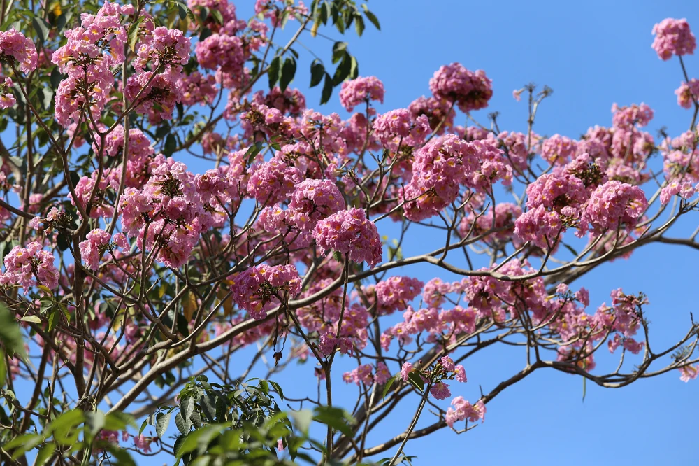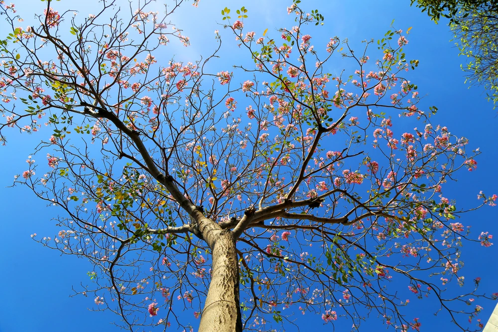 Những chùm kèn hồng bung nở rực rỡ trong nắng.