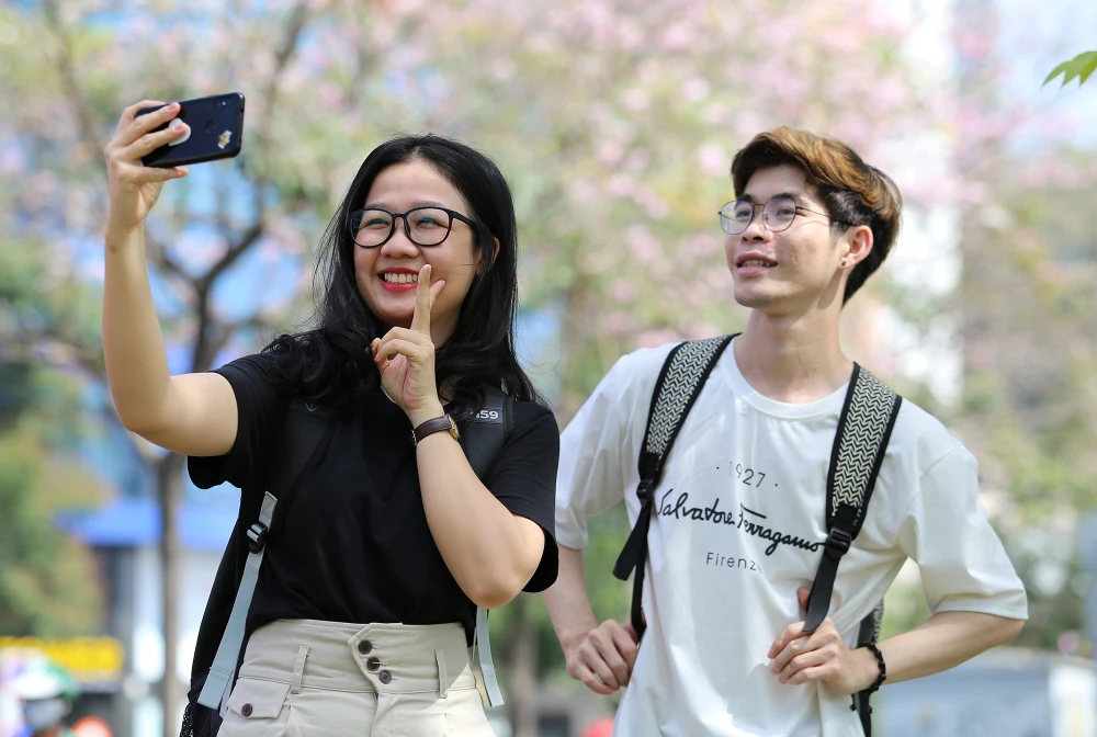Nhiều bạn trẻ tìm đến những cây kèn hồng vừa bung hoa để chụp ảnh.