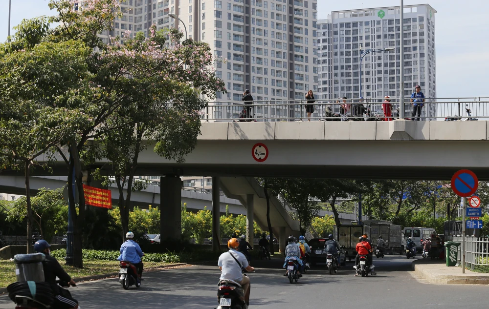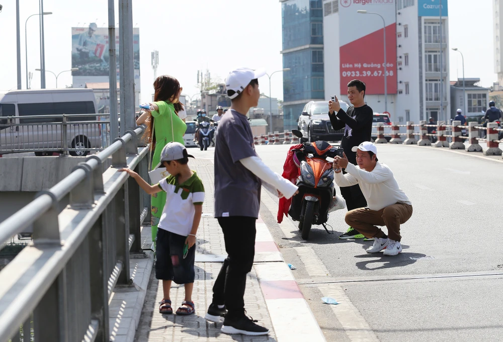 Trên cầu Calmette (quận 1), nhiều người nán lại chụp ảnh với hàng cây kèn hồng.