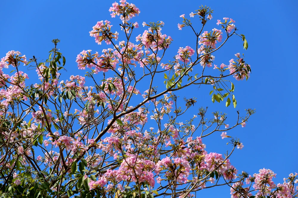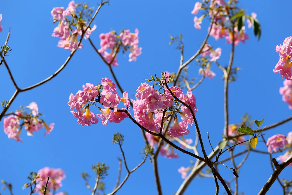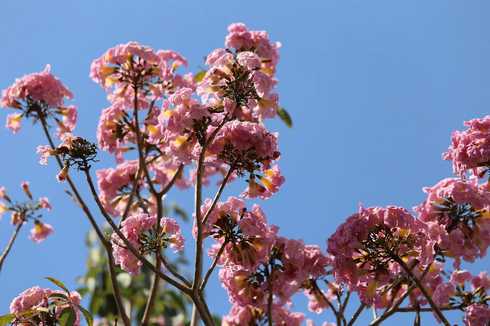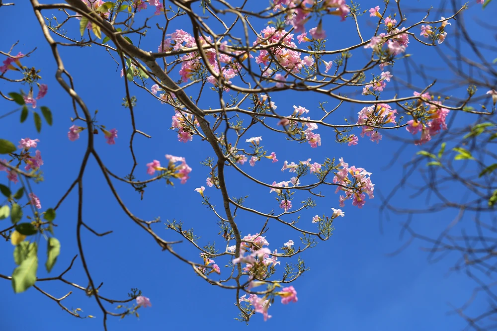 Cây kèn hồng rụng hết lá để nhường chỗ cho những chùm bông bung nở.